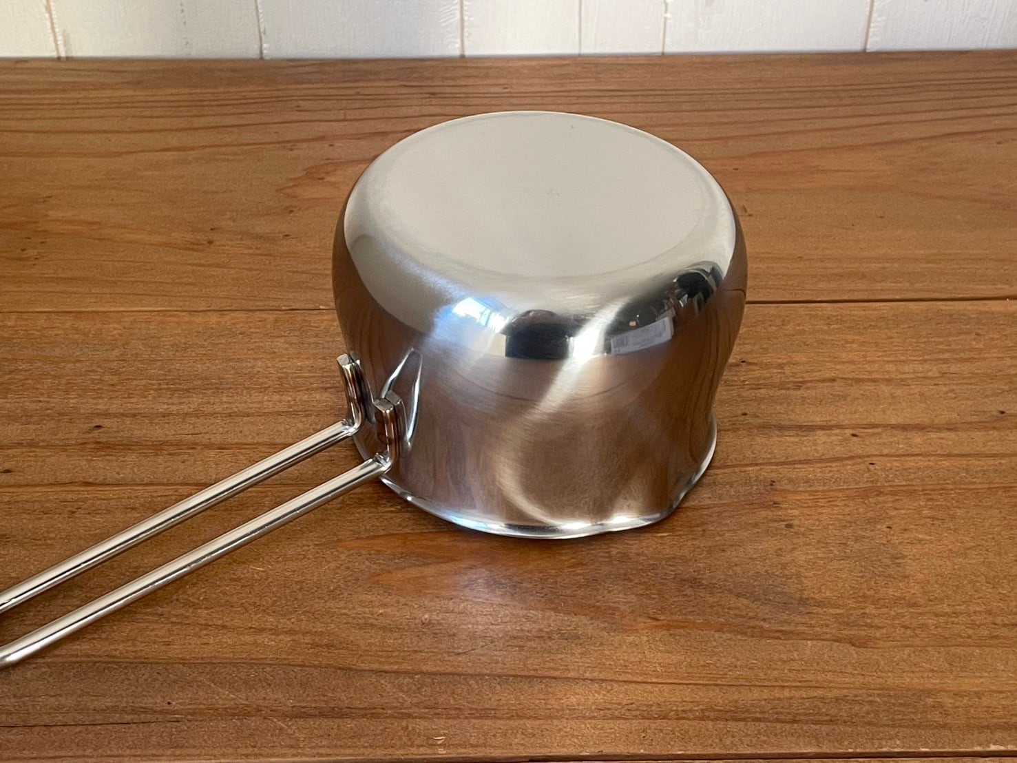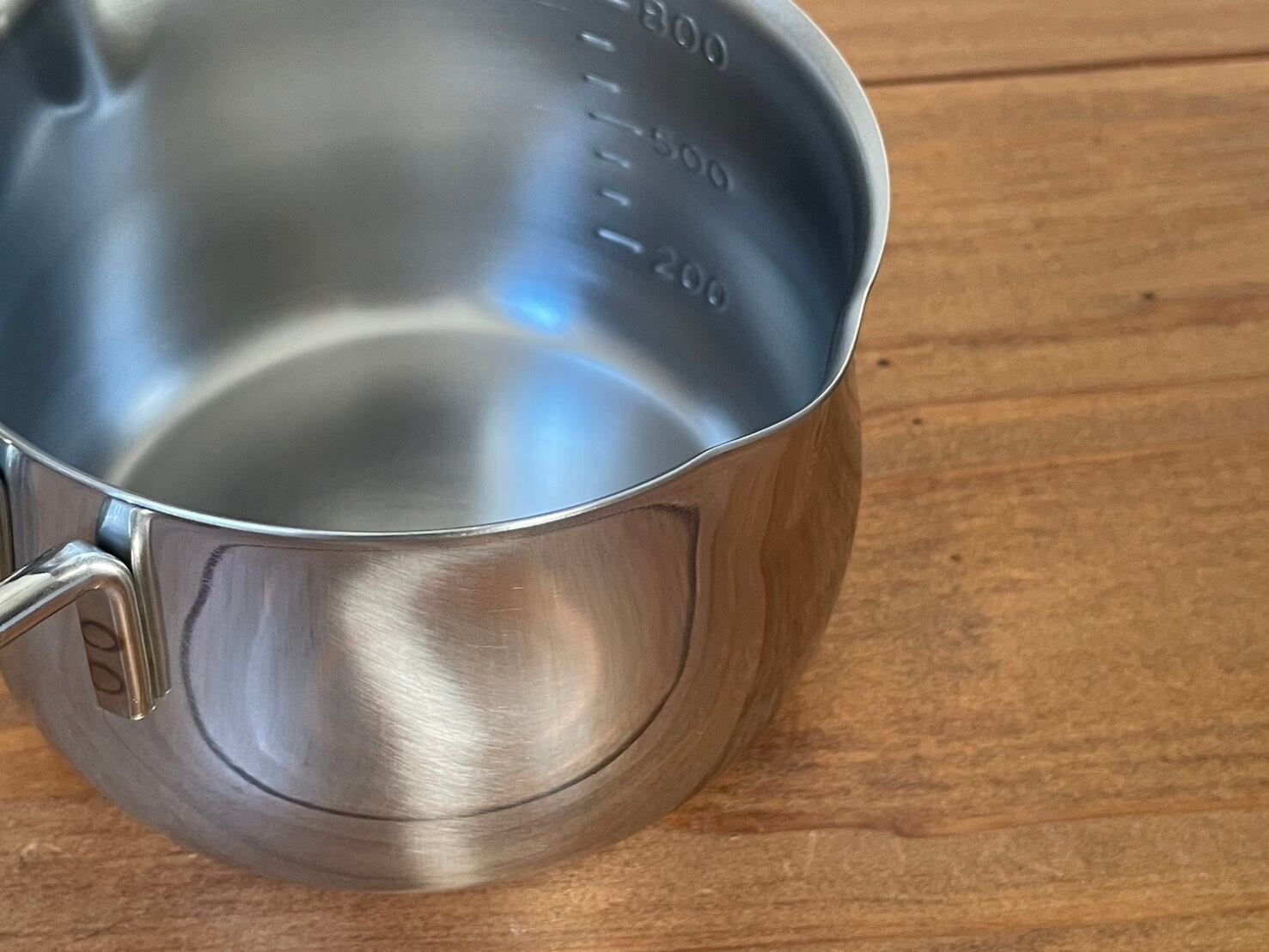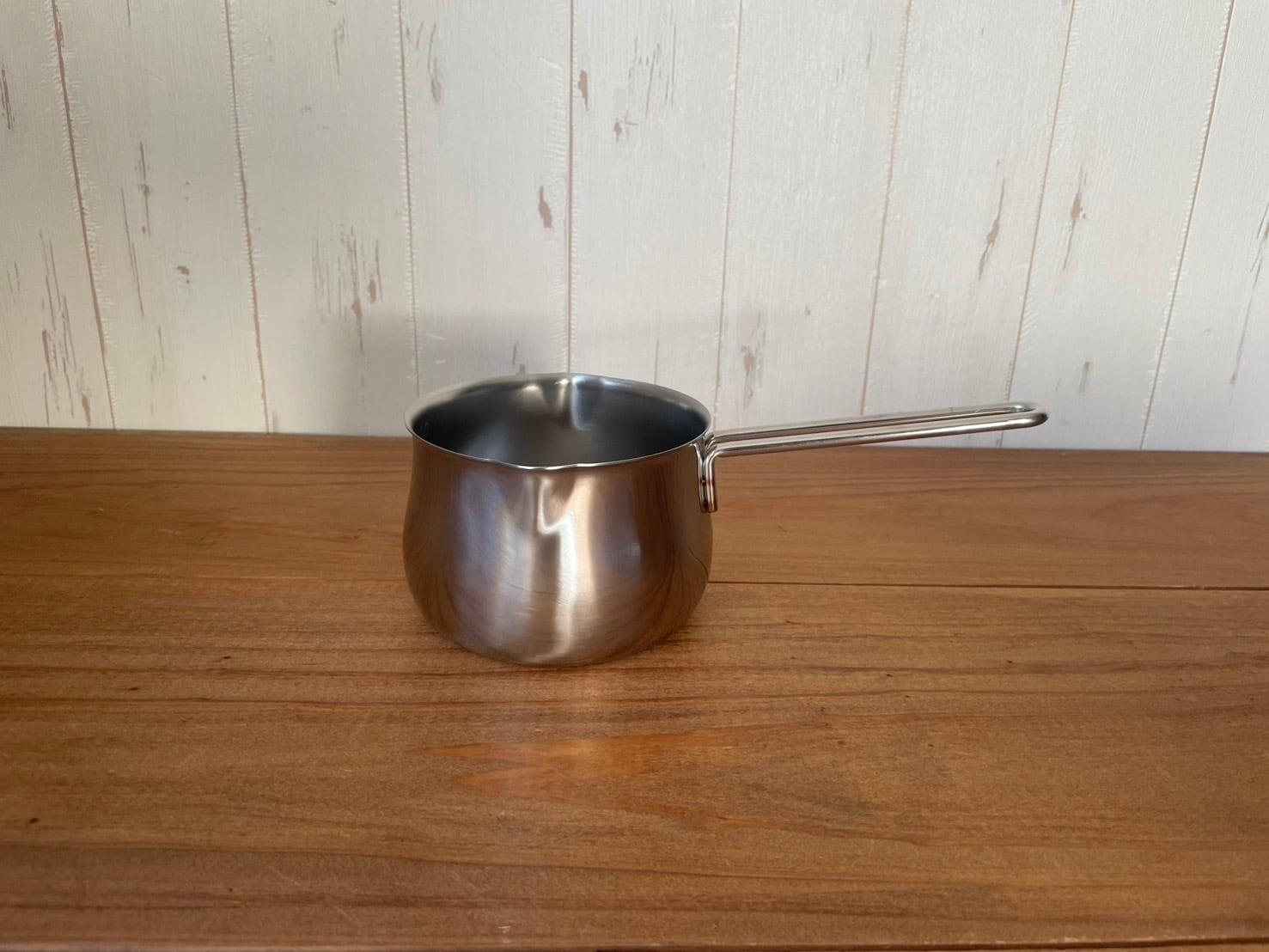 シンプルなデザインのステンレス製ミルクパン、持ち手も本体もオールステンレスで作られています。