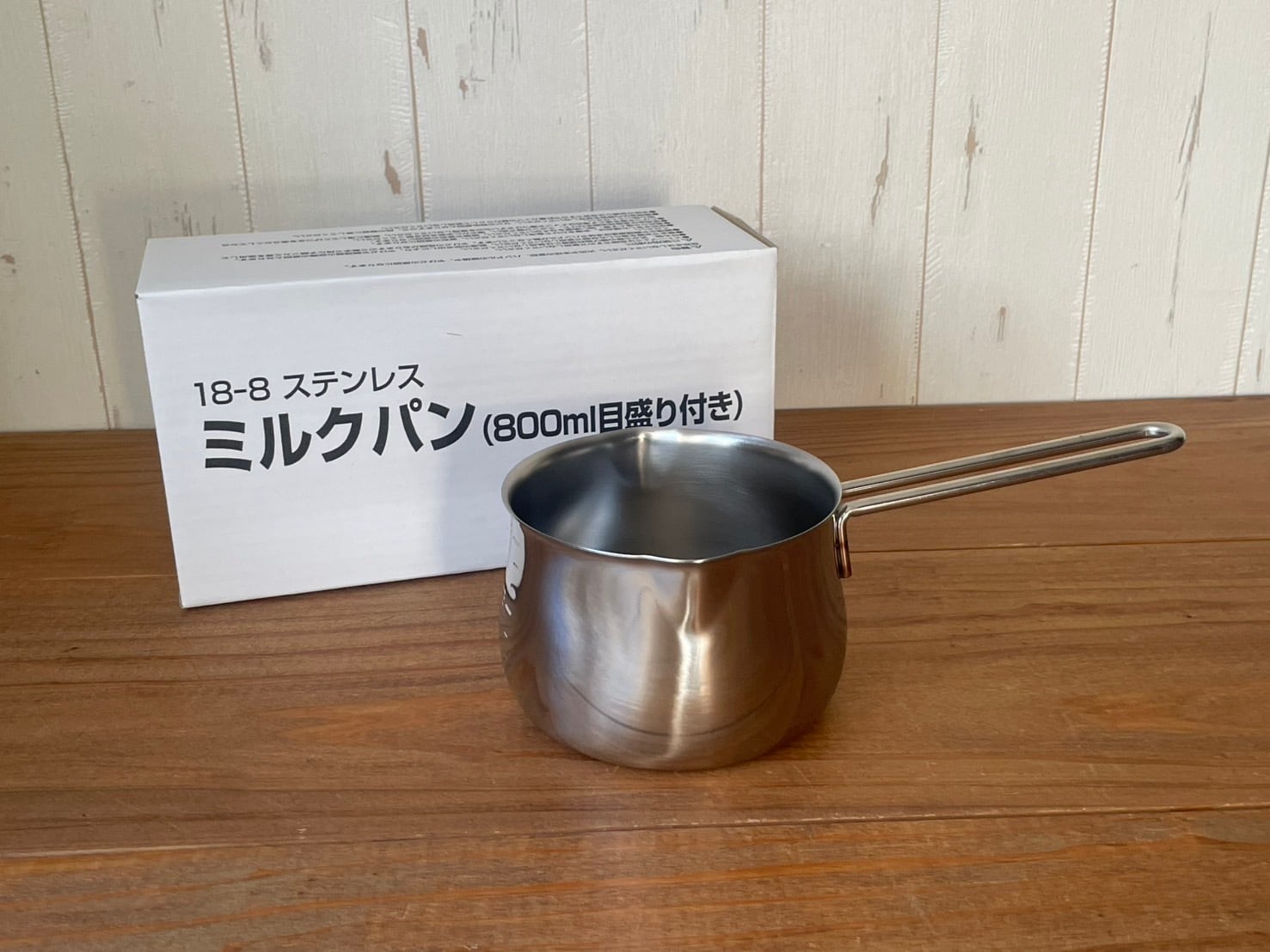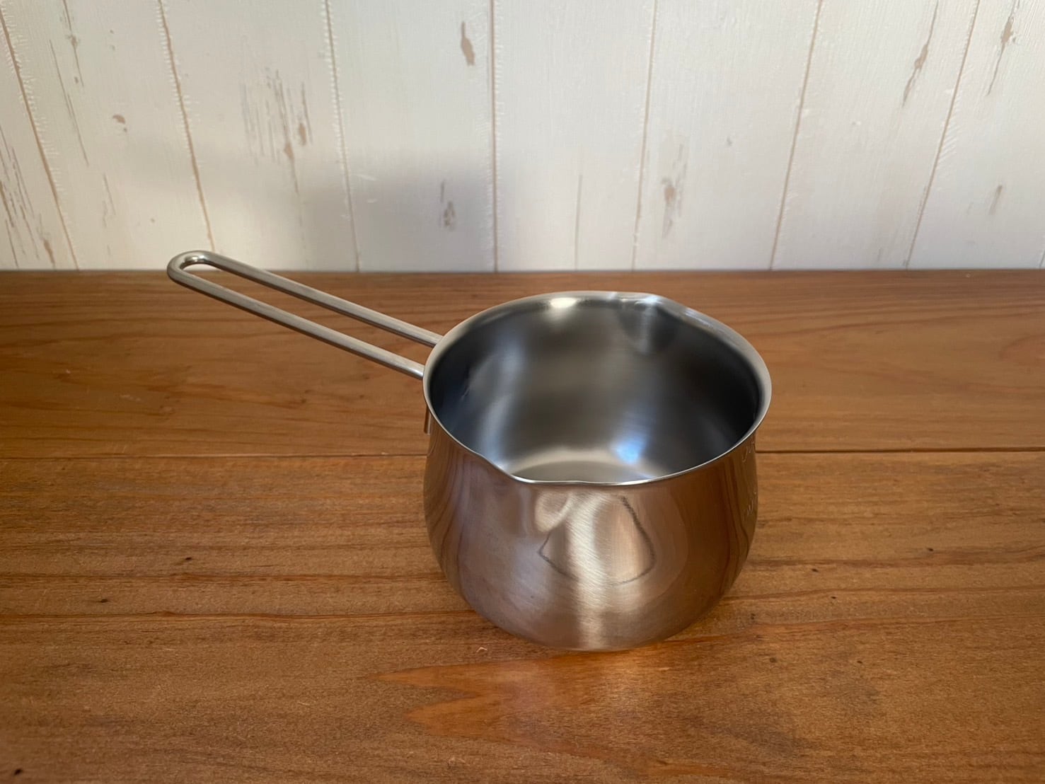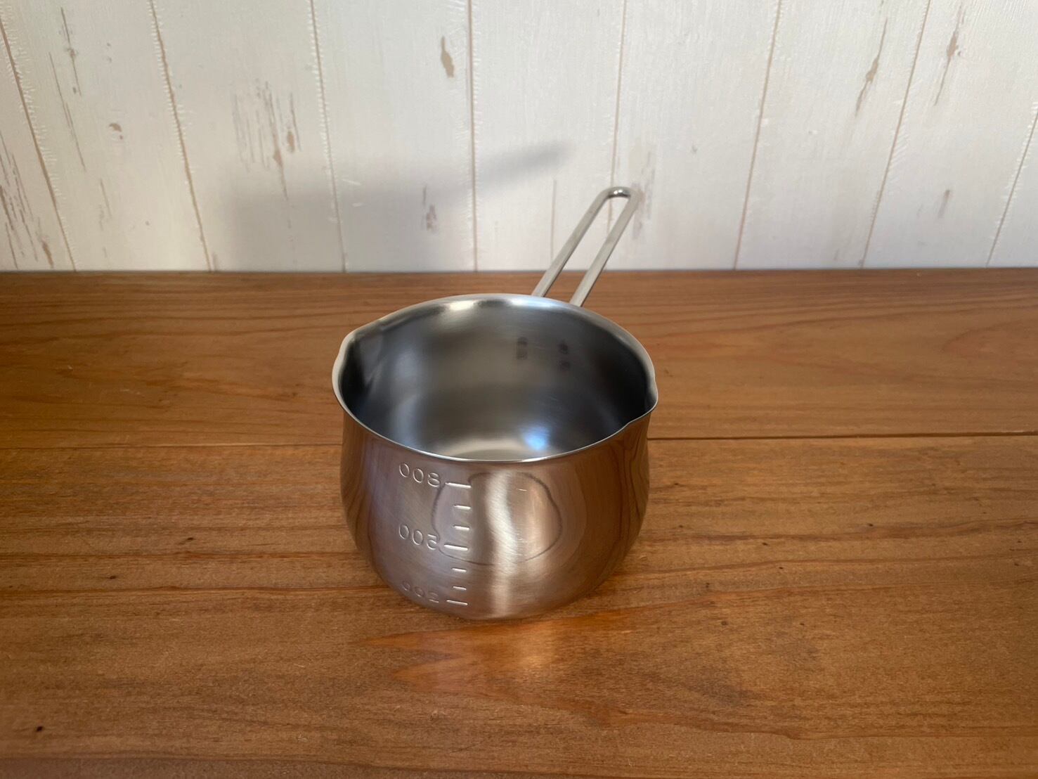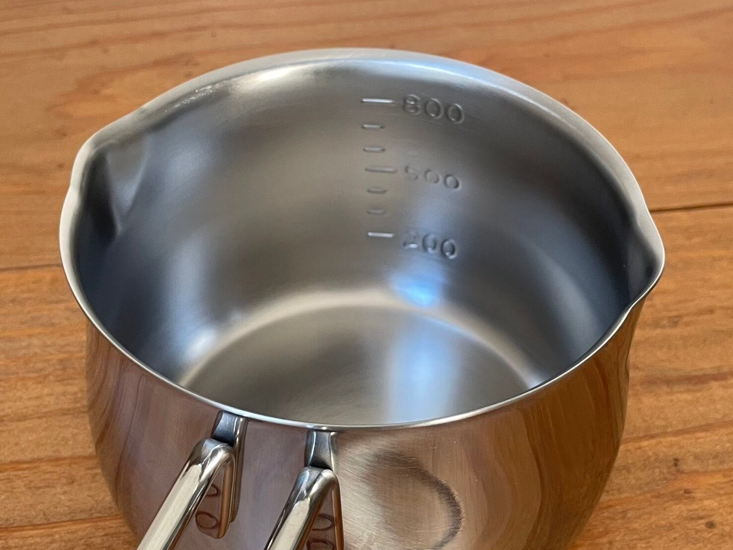 シンプルなデザインのステンレス製ミルクパン、持ち手も本体もオールステンレスで作られています。