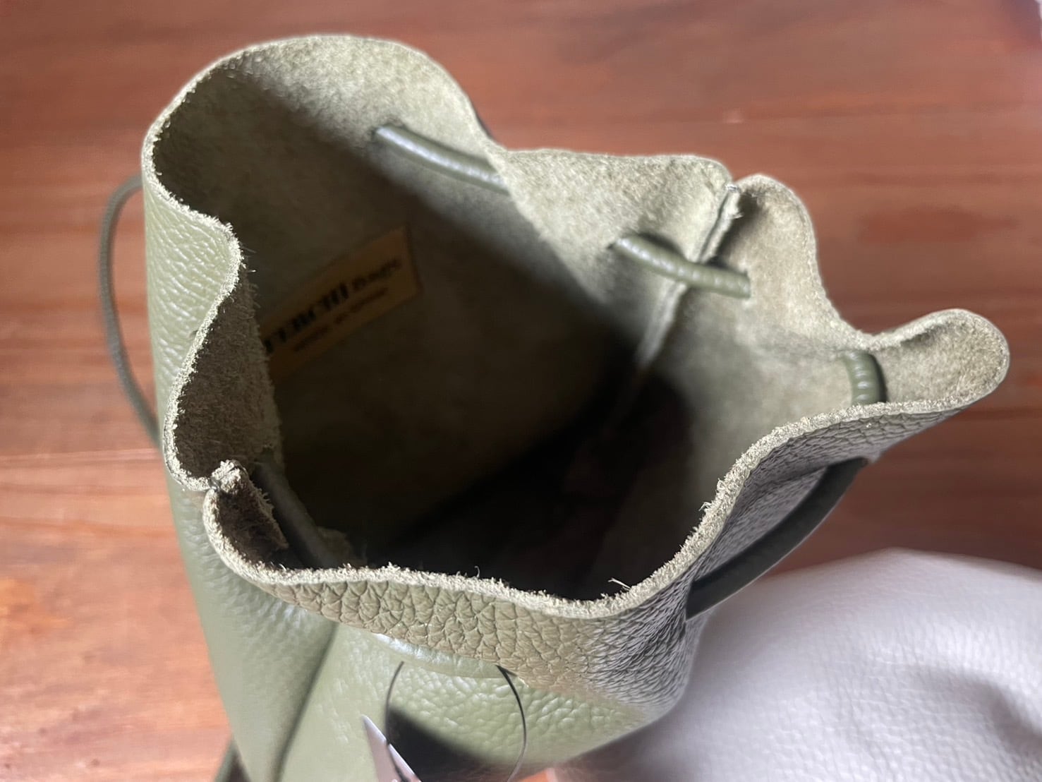 ショルダー部分の紐と巾着の口が繋がっていますので、柔らかなレザーは絞りやすく、中のものも取り出しやすいです。