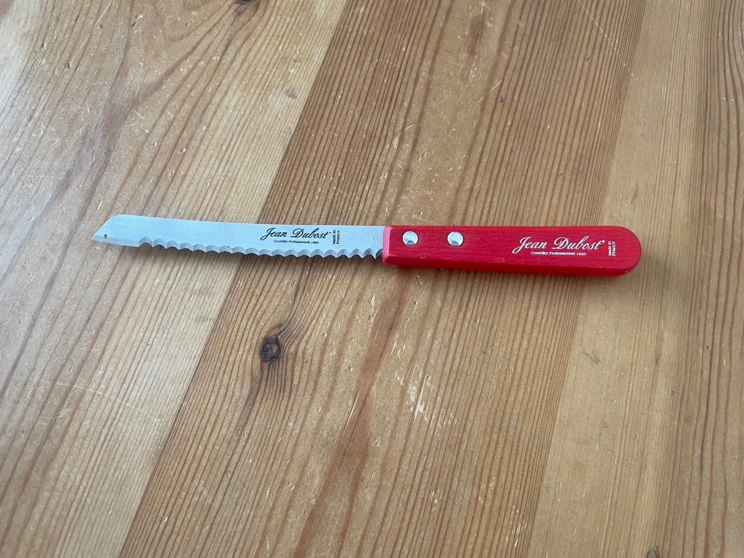 ジャンデュポ社で作られているウッドハンドルのミニブレッドナイフです。 卓上でバゲットをカットするときに使いやすいミニサイズ。 トマトのスライスやバゲットサンドイッチ、ドライフルーツやナッツ入りのパンなどもサクッと気持ちよくカットできます。 今回入荷したカラーは、レッド、ホワイトの2色です。 Jean Dubost ウッドハンドルミニブレッドナイフ 全長21.5cm(刃渡り11.5cm)幅約2cm Made in France