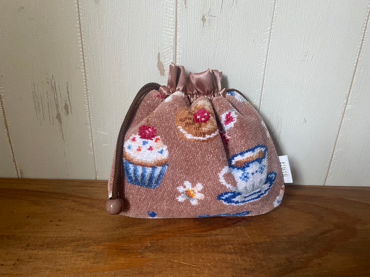 紐の先にはベージュのパーツがついており、巾着の開け閉めがしやすくなっています。