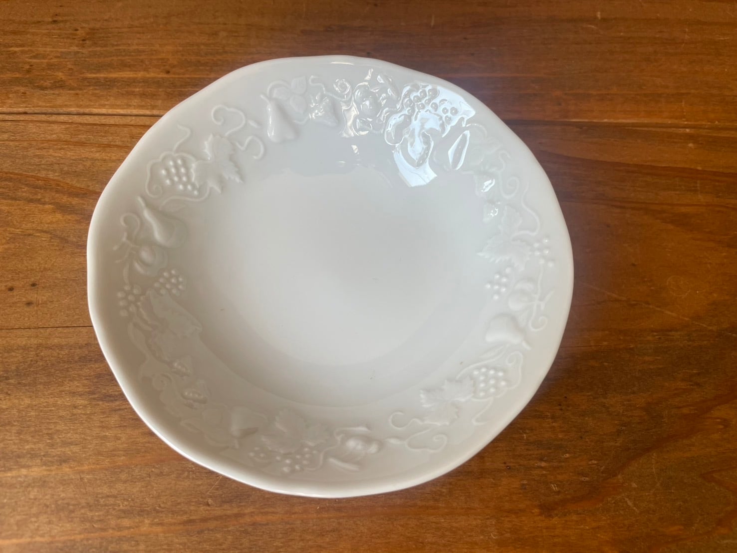上品な白磁に洋梨やブドウ、いちごやチェリーなどのフルーツが立体的に表現されています。